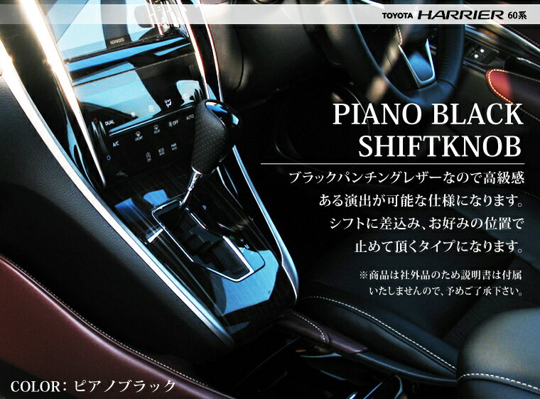 適合車種 トヨタ ハリアー60系 【型式】 ZSU60W ZSU65W セット内容 シフトノブ 1P カラー ピアノブラック×ブラックパンチングレザー 商品説明 ハリアー60系専用の純正交換型ピアノブラックカラーのシフトノブです。